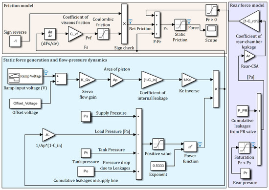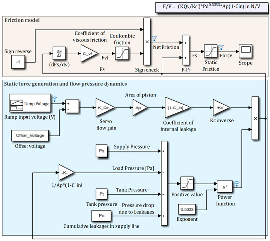 where is the static force, and all other terms are the same as described in Section 3.1. Clearly, the static force model suggests that the force output by the servo valve controlled actuator is a function of the net flow-pressure coefficient (), the flow coefficient of servo valve (), the piston area, and the voltage (, and that the dependence is linear.