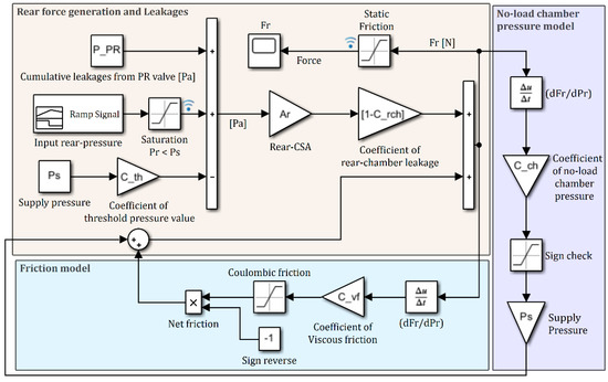 The force applied by the actuator for when it is controlled by supplying fluid to the rear chamber is simply a function of the pressure in the rear chamber () and the area of the piston () in the rear chamber, which, as is evident in the schematic in Figure 1, is different than the main piston controlled by the servo valve. The pressure in the rear-chamber is governed by the pressure reducing valve. Assuming the servo valve to be turned off, the resulting force due to the rear chamber is: