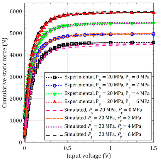 As is evident from Figure 4a, forces increase with increasing voltages, and then saturate, i.e., when forces reach their saturation limits, a further increase in the voltage does not increase the force. Figure 4a only shows representative results for a fixed supply pressure of 18 MPa and for the forward path, and as is evident from Figure 4b which summarizes results for other pressures, and also for the reverse path—the force characteristics are similar to the case shown in Figure 4a, i.e., forces always saturate. As is also amply evident from the comparisons in Figure 4b, the linearized static force model cannot capture the measured behavior. The model suggests a linear relationship between the force and the voltage with the coefficients contributing to the slope. The model also is not dependent on the supply pressure. Experiments on the other hand suggest that forces change with supply pressure, and that forces are nonlinearly dependent on the supply voltage. Experiments also suggest that there is a certain threshold voltage that must be reached before the actuator applies a force, and that forces saturate after a certain other threshold voltage is reached. Experiments further demonstrate hysteresis in the measured forces changing with increasing and decreasing levels of voltages. All these observations clearly demonstrate that the linearized static model is inadequate.