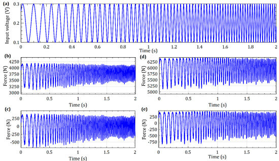 then conducted to apply a target static load of 785 N that was to be superposed with a ±196 N dynamic force in the frequency range of 1 Hz to 300 Hz. This reference force is shown in Figure 21a. The model-based force tracking of this reference is shown in Figure 21b, and the measured force tracking of the reference input is shown in Figure 21c. The closed-loop simulation and experiment runs for 300 s, with each second of data corresponding to each excitation frequency in the range of 1 Hz to 300 Hz.
