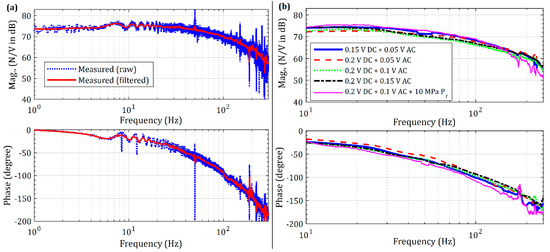 Measured open-loop frequency response of the actuator under different test conditions; (a) measured and filtered measured frequency response; (b) filtered measured frequency responses at different levels of input voltages showing linear dynamic response of the actuator.