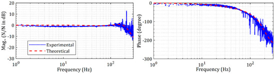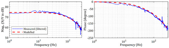 As is evident from Figure 21, the modelled and measured force response closely track the reference input force till ~200 Hz (~200 s), beyond which the magnitude of force response is significantly reduced. The operating closed-loop bandwidth of the actuator is identified by transforming the time domain data presented in Figure 21 into the frequency response function as shown in Figure 22.