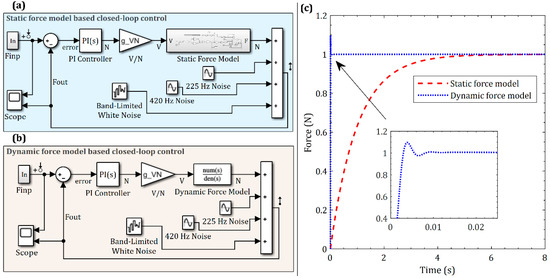 Model-based closed-loop control of the actuator; (a) Simulink model for static force model based closed-loop control; (b) Simulink model for dynamic force model based closed-loop control; (c) closed-loop step response of actuator using static and dynamic force models.