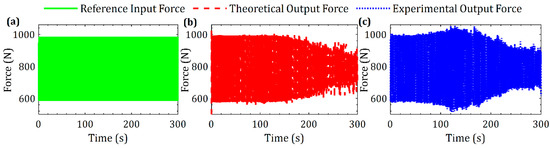 Theoretical and experimental closed-loop force response: (a) reference input force; (b) theoretical output force; (c) experimental output force.