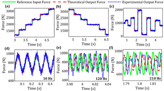 In addition to characterizing the bandwidth of the actuator, force responses for different kinds of step loading and for different kinds of fixed frequency excitations were investigated to further validate the closed-loop performance of the actuator. These results, as shown in Figure 23, include step loading scenarios with increasing step loads (Figure 23a), decreasing step loads (Figure 23b), random step loads (Figure 23c), and fixed frequency excitations for 785 N static loads superposed with 196 N sinusoidal dynamic loads at three different frequencies—at 10 Hz (Figure 23d) and at 120 Hz (Figure 23e), which as well is within the bandwidth, and at 210 Hz (Figure 23f), which is marginally beyond the actuator bandwidth. Experimental results in Figure 23 also depict the reference target loads as well as the model-predicted tracking loads to make comparisons more meaningful.