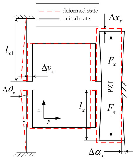The piezoelectric actuator is vertically elongated after the voltage is applied, and the two inner bumps of the hourglass displacement amplification mechanism are subjected to the driving force of the piezoelectric actuator, and the hourglass elastic plate hinge generates a swing angle of . The elastic plate is elastically deformed, resulting in displacement deformation and angular deformation, effective amplification the piezoelectric actuator output displacement , and pulling the inner substrate to realize the X-direction movement in combination with the guiding function of the transfer mechanism of displacement, thereby realizing the movement of the micro-positioning platform in the X direction.
