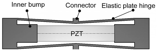 Through the design and analysis of the hourglass displacement amplification mechanism to effectively amplify the driving volume of piezoelectric actuators. Figure 3 shows an hourglass displacement amplification mechanism, which is mainly composed of inner bump, connector, piezoelectric actuator and elastic plate hinges. The piezoelectric actuator is connected to the inner bump.
