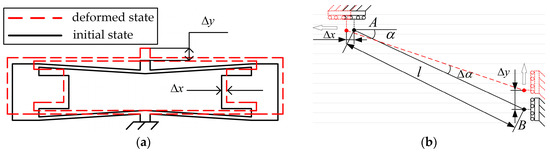 The working principle of the hourglass displacement amplification mechanism is shown in Figure 4a. Figure 4b is an elastic plate hinge motion model of the hourglass displacement magnification mechanism. The hourglass displacement amplification mechanism provides a certain preloading force for the piezoelectric actuator to be clamped horizontally between the two inner bumps of the amplification mechanism. The bump can increase the stiffness of the hourglass displacement amplification mechanism and reduce the displacement loss. When the piezoelectric actuator inputs the driving amount of to the amplifying mechanism at point A, the driving volume causes the elastic plate hinge to elastically deform and generates turning angle at points A and B, thereby causing the amplified displacement at point B to be generated.