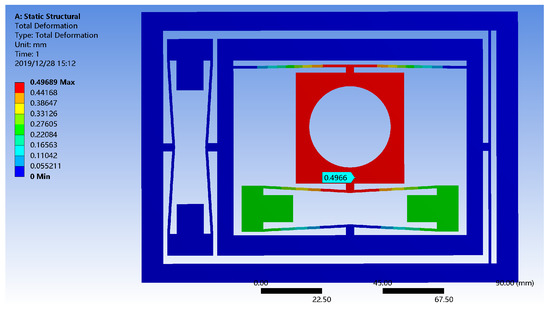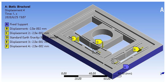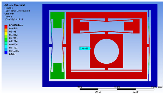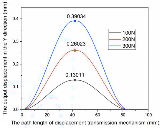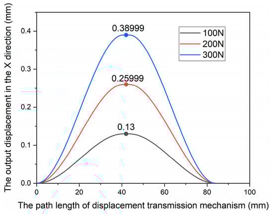 In ANSYS/Workbench, 100 N, 200 N and 300 N driving forces were respectively applied to the X and Y directions of the micro-positioning platform for simulation analysis. The force acts on the mounting surface of the piezoelectric actuator and the displacement amplification mechanism, and the direction of the force is the same as the extension direction of the piezoelectric actuator. Figure 8 shows the output displacement on the path of the displacement transmission mechanism under the driving force in the X direction, and Figure 9 shows the output displacement on the path of displacement transmission mechanism under the driving force in the Y direction.
