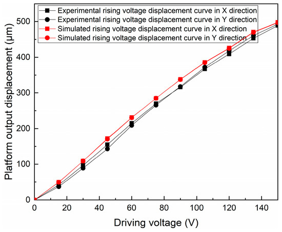 In the voltage range of 0–150 V, the simulated output displacement of the micro-positioning platform is slightly higher than the experimental output displacement, and the overall trend is consistent. According to the experimental test, the maximum output displacement of the micro-positioning platform in the X direction is 489 μm, and the maximum output displacement in the Y direction is 493 μm.