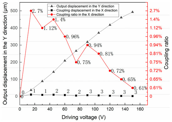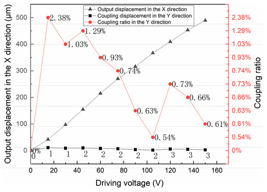 At present, a major problem in the 2D micro-positioning platform is that the motion interference and coupling are serious in XY directions. Therefore, it is necessary to carry out experimental tests on the coupling displacement of the micro-positioning platform in X and Y directions. A driving voltage of 0–150 V with a step size of 15 V is applied in the X and Y directions, respectively, and the coupling displacement in the Y and X directions is measured.