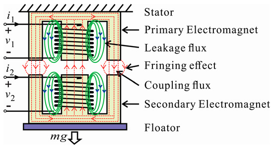 A basic model of AC magnetic suspension is shown in Figure 1a. The electromagnets face each other with a variable gap x, the electromagnet on the upper side is the primary electromagnet, and the lower side is the secondary electromagnet. The primary electromagnet is fixed with a stator, and the secondary electromagnet is fixed on the floator. Attractive force F and gravity mg act on the secondary electromagnet with the floator. The floator with a mass of m is assumed to move translationally only in the vertical direction.