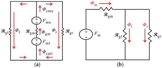 The reluctance of core material is neglected and redrawn the equivalent magnetic circuit: (a) equivalent magnetic circuit avoiding reluctance of the core material; (b) approximate equivalent magnetic circuit of the basic model.