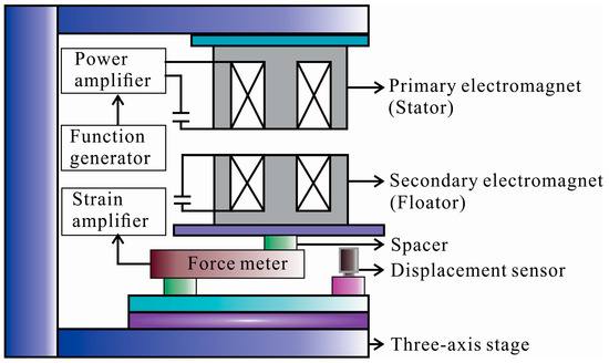 Several experiments are carried out to investigate the fundamental characteristics of the apparatus, as shown in Figure 6. Two electromagnets are faced with each other with a gap that can be varied using a three-axis stage. The primary electromagnet is fixed with the base that is considered as a stator. The secondary electromagnet is placed on the floator that is considered as a floator. A function generator is used to supply the AC voltage to the primary electromagnet through a power amplifier. The force is measured by installing a cantilever type force meter using strain gauges under the floator, which is connected to the strain amplifier. The current of each coil is measured by the current probe, and the displacement sensor is used to maintain the gap for measurement.