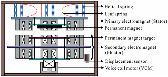 An experimental apparatus used for investigating suspension characteristics to achieve self-stabilization is shown in Figure 7. It is very difficult to suspend one secondary electromagnet (floator) by one primary electromagnet (stator) due to the tilting motions. So, three primary electromagnets with the same configuration are placed on a circular plate as a stator, as shown in Figure 7. Three secondary electromagnets with the same configuration are placed on both top and down of a circular plate as floators. A permanent magnet is incorporated into the stator plate to reduce the power supply to the primary electromagnets by adding an extra attractive upward force to the floator. To confirm the self-stabilization of the suspension, an external sinusoidal disturbance force is made to act on the floator in the direction of the gravity force using a voice coil motor (VCM). A displacement sensor is used to measure the displacement of the floator. The stator is overhung by helical spring to suspend the stator flexibly in the vertical direction. A leaf spring is used to contain the single-degree-of-freedom of the oscillation laterally.