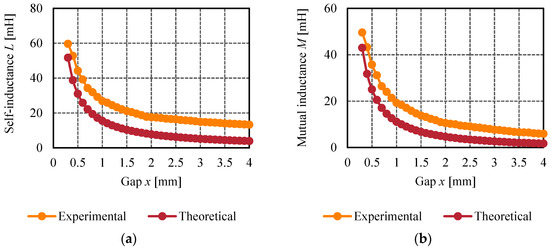 The self-inductance and the mutual inductance are measured experimentally. The self-inductance of the primary coil is measured while the secondary coil circuit is open or vice-versa. The mutual inductance is measured while both the coil circuits are closed. Figure 8a depicts the comparison between theoretical and experimental results of the self-inductance. Theoretical self-inductance is calculated from static numerical analysis using Equation (5) where turns, mm2, is from 0 to 4 mm. The actual cross-sectional area of flux density in the air gap is higher than the cross-sectional area in the core due to the fringing effect. This also dynamically changes with the change of the gap x. We avoided this fringing effect in numerical analysis. Also, there is some machining error to measure the gap while experiments are conducted. The theoretical and experimental characteristics of the self-inductance show that the inductance decreases with the increasing of the gap x.