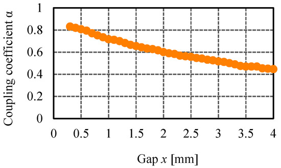 Figure 8b shows the comparison between the theoretical and experimental results of the mutual inductance . The theoretical mutual inductance is calculated from the static numerical analysis using Equation (6) where α is the measured value, is the theoretical value for mm. It is difficult to estimate the accurate coupling coefficient α analytically. The measured coupling coefficient α is calculated using Equation (7) where the measured values of the self-inductance and the mutual inductance are considered. Figure 9 illustrates the characteristics of the coupling coefficient α to the gap x. The theoretical and experimental characteristics show that the mutual inductance decreases with the increasing of the gap x. To calculate the currents and force using the measured value of self-inductance, mutual inductance, and coupling coefficient, we have made a functional relationship of self-inductance , mutual inductance , and coupling coefficient with the gap of m by applying a curve fitting function as mentioned in Equations (15)–(17), respectively.