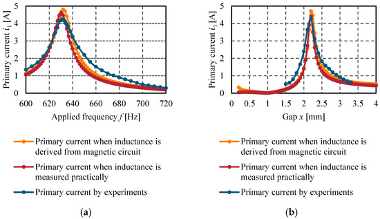 The comparison of the characteristics curve of the primary current: (a) when the gap x is 2.0 mm; (b) when the applied frequency f is 650 Hz.