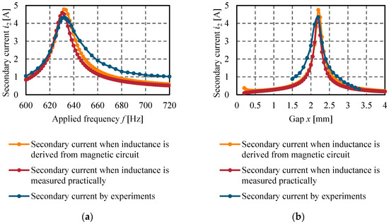 Figure 11 shows the characteristics of the secondary current , which is also estimated in the same way as mentioned in the primary current. With the same principle and process, we calculated the amplitude of the secondary current using Equation (13). The analytical results are compared with the experimental results in Figure 11a when the gap x is 2.0 mm, and in Figure 11b when the applied frequency f is 650 Hz. It is observed that the primary and secondary electromagnets have almost the same peak level at the same resonance frequency of 632 Hz and the gap x of 2.2 mm, which is a suitable characteristic for efficient wireless power transfer. Moreover, it is proved that the self-inductance in each coil remains the same because currents and turn number of coils are same.