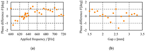 Figure 12 illustrates the characteristics of the phase difference θ between the primary current and secondary current . The phase difference θ is measured experimentally. Figure 12a shows the phase difference when the gap x is 2.0 mm, and Figure 12b shows the phase difference when the applied frequency f is 650 Hz. Experimental results satisfy the assumption that was considered in the theoretical analysis as the phase difference θ is virtually zero.