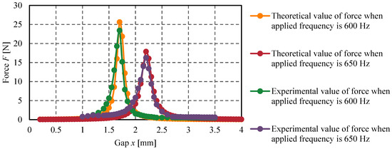 The comparison of the characteristics curve of electromagnetic attractive force: (a) when the gap x is 2.0 mm; (b) when the applied frequency f is 650 Hz.