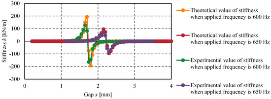It is proved that resonance frequency changes with the gap x and the applied frequency f accordingly, as shown in Figure 14. The essential characteristic of self-stabilization is the stiffness k, which is shown in Figure 15. The value of stiffness k is estimated from measured force-gap characteristics by from Figure 14. It indicates that the stiffness is a nonlinear function of the gap, which is a property similar to the coupling coefficient in an energy harvesting system [38]. The stiffness increases when the gap increases within mm. Such characteristic is called positive stiffness, which enables the floator to levitate without using any controller. Positive stiffness lies in mm when the applied frequency f is 600 Hz and mm when the applied frequency f is 650 Hz. It is found that the region of the gap with positive stiffness tends to be wider, and the gap with maximum stiffness becomes lower as the applied frequency increases. The behavior of the stiffness k changes with the variable applied frequency f. These results demonstrate that the stiffness of suspension can be adjusted by changing the gap and the applied frequency. The comparison between theoretical and experimental results show comparatively good agreements. So, it can be said that self-stabilization is possible in the range of positive stiffness region.