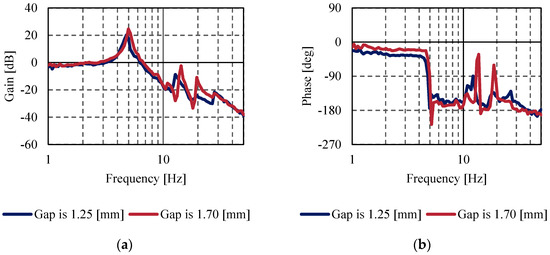 The frequency responses of the suspension to disturbance to the floator when the gap x is 1.25 mm and 1.70 mm: (a) gain diagram; (b) phase diagram.