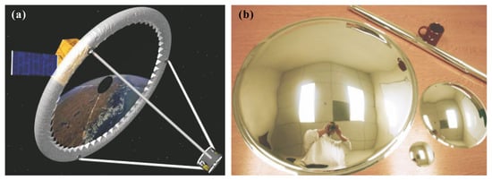 An alternative option consists of making the reflector out of a polymer elastic shell molded in its final shape and rolled for stowage; once released in orbit, the reflector unfolds on its own strain energy to achieve its final shape (Figure 1b) [,]. Of course, this approach may not be suitable for high accuracy imaging reflectors, but there are less stringent applications such as LIDAR, laser communication and light collectors for spectroscopy. Besides, the wavefront can be further corrected by Adaptive Optics (AO).