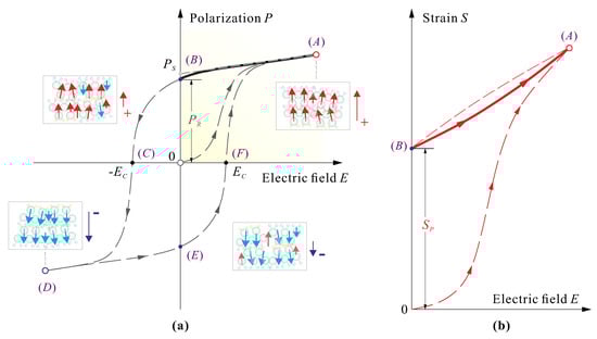 Figure 2a shows the polarization diagram of a ferroelectric material []; the origin O corresponds to the virgin material where the domains are randomly oriented. As the electric field E increases, the domains start to switch in the direction of the field and the charge density follows the curve OA. At point A, all the domains are aligned and the polarization behaves linearly; if E decreases, the polarization diagram behaves nearly linearly along the segment AB, to achieve the remnant polarization when . If the electric field is increased again, the polarization will follow the segment BA which is nearly linear; the intersection of the linear approximation and the polarization axis is called the spontaneous polarization. When the electric field becomes negative, the polarization diagram follows the segment BC; the domains start gradually to switch in the opposite direction and, when E reaches the coercive field, , the polarization is reversed and the polarization diagram follows the segment CD. If the electric field is increased again, the polarization diagram follows the trajectory DEFA which is symmetrical of ABCD. Figure 2b shows the strain versus electric field diagram of the material for positive value of E (first quadrant of the so-called butterfly curve); the virgin material follows the segment OA until the maximum value of the electric field. When E is reduced to zero, the strain follows the segment AB; when , the strain return to a nonzero value called the poling strain . Subsequently, if the electric field does not change sign, the strain will remain on the segment BA which can be approximated by a parabola, typical behavior of electrostrictive materials. Note that the diagram involves some hysteresis which will be neglected in the mathematical model below.