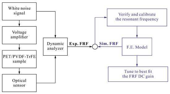 The estimation of the piezoelectric coefficient is based on the dynamic analysis of a set of rectangular samples (Figure 3) made of 175 m of Polyethylene terephthalate (PET) covered by a spin-coated layer of 5 m of PVDF-TrFE between Aluminum electrodes. The samples are cantilevered with a length between 50 and 70 mm; they are modelled with finite elements (FE) (Mindlin multilayer piezoelectric plate in the software SAMCEF from Samtech-Siemens) [,].