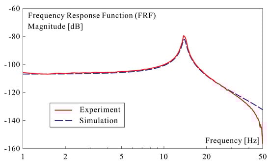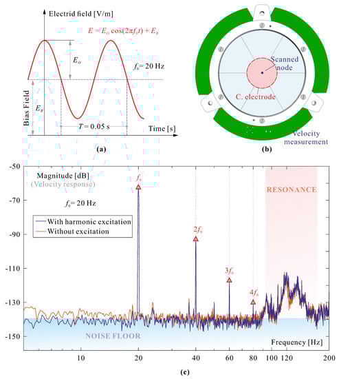 where is a constant bias, is the amplitude of the harmonic component (Figure 7a). The frequency is well below the first structural resonance, so that the structure responds quasi-statically. A laser Doppler velocimeter is used to monitor the velocity response of one structural node; from Equation (7)