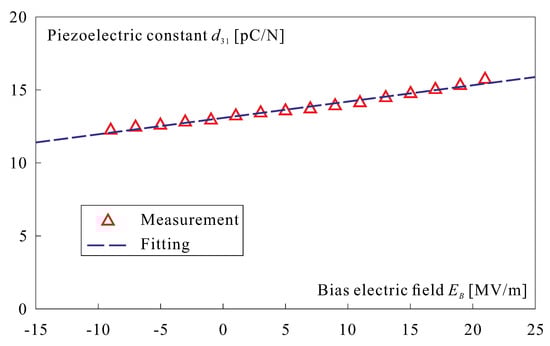 Thus, the electrostrictive constant may be obtained by estimating the piezoelectric constant for various bias field (Figure 6). Assuming 0.34 and , one finds −13.5 m/C; this value is in line with the literature [].