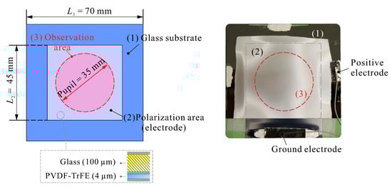 Alternatively, a direct measurement of the poling strain has been performed on a thin film of 4 m deposited on a square glass substrate of 70 mm side and 100 m thickness. The electrodes cover a square of 45 mm side in the center and the surface figure is monitored in a central circular pupil of 35 mm (Figure 8) with Phase-Shifting Schlieren (PSS) wavefront sensor NIMO RE 2507 [].
