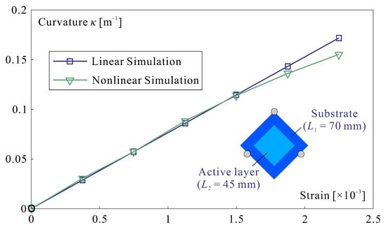 Since only the central part of the sample is covered by active material, Stoney’s formula cannot be used to relate the strain induced by the polarization to the curvature of the glass sample. Instead, the system is modelled by finite elements. Figure 9 shows the relationship between the average curvature in the central pupil and the misfit strain induced in the electrostrictive layer (the two curves correspond to linear and nonlinear FE calculations, both obtained with SAMCEF).