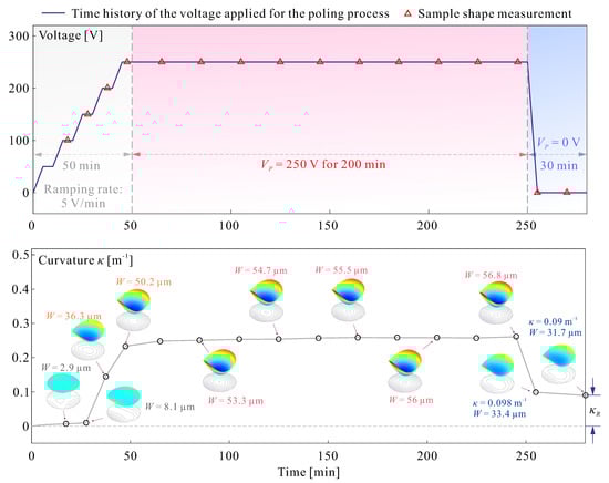 Time-history of the poling process of the sample of Figure 8. (Top): voltage history. (Bottom): relative surface figure deformation within the pupil (deflection W and curvature ). The final curvature residual estimate is m.