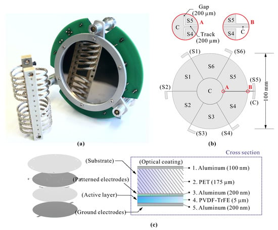 This method has been applied to the test structure with a diameter mm and seven independent electrodes discussed earlier. Figure 13a shows the demonstrator in its support. The electrode layout is that of Figure 13b (all electrical connections are outside the pupil of the mirror). The segmented control electrodes are located between the substrate and the PVDF-TrFE layer in order to minimize the risk of arcing when neighboring electrodes have strongly different voltages (Figure 13c). The manufacturing sequence is as follows: the patterned electrode is deposited on a PET sheet by Pulse DC Magnetron Sputtering (PDCMS) and the substrate is shaped in a spherical mold (under pressure and temperature); then, the PVDF-TrFE layer is spin-coated, and the shell is placed again in the mould for annealing the PVDF-TrFE. Finally, the optical coating and the ground electrode are deposited by PDCMS.