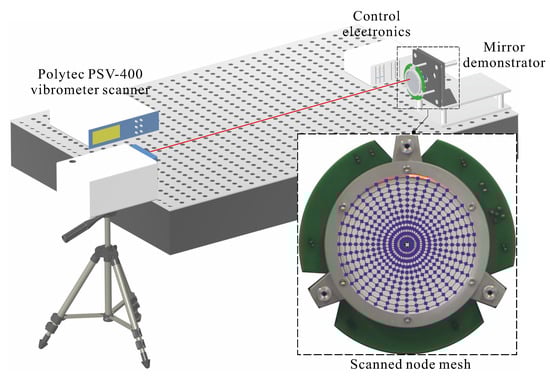 The first resonance of the structure is Hz; the harmonic voltage excitation applied to the electrodes has been selected Hz where the dynamic amplification is negligible; the amplitude of the input voltage is 40 V with a bias of 65 V. The scanner vibrometer Polytec PSV-400 is used in the experiment; the experimental set-up is shown in Figure 14, together with the layout of the scanned nodes. Because of the curvature, the reflecting side is covered by a thin layer of scattering powder (Ardrox developer spray) in order to reflect enough light to the scanning head. It has been verified that the results are independent of the excitation frequency provided the condition is satisfied, and that the results are consistent with the NIMO sensor for smaller apertures.