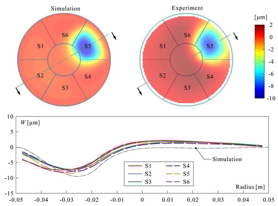 (Top): Comparison between experiment and simulation of the deformation induced by a voltage of 100 V being applied to electrode S. (Bottom): Displacements along the 6 cross sections rotated by 60° The dashed line corresponds to the numerical simulation.