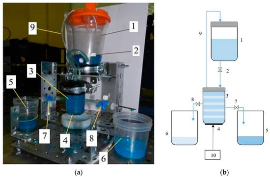 Microparticles separation setup photo (a), and hydro-electrical scheme of the experimental set-up (b): 1—container of the microparticles in biological suspension; 2—adjustable inlet valve; 3—CFC (Ø 41 × Ø45 × 72 mm) of the acoustic separator; 4—DSPTB of the acoustic separator; 5—phase of the suspension enriched in microparticles; 6—purified phase of the suspension; 7—outlet valve of the phase of the suspension enriched in microparticles; 8—outlet valve of the purified phase of the suspension; 9—air escape valve; 10—controller of the disk-shaped piezo transducer-bimorph.