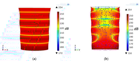 The numerical values of the vibrating deflection shapes of the fourth eigenmode (Figure 3), as well as the frequency averaged spectrum of the DSPTB (Figure 5a,b) and of the CFC (Figure 6a,b), show that the DSPTB and the CFC vibration resonances are expressed at the near excitation frequency of f0 = 13.5 kHz. For this fourth eigenmode, the bandwidth of the resonance curves in the three coordinate directions was larger than for the lower eigenmodes. When switching to a higher mode, the number of microparticle concentration zones increased; however, the acoustic pressure no longer had such a high value. An agreement between model and data, which is characterized by almost the same excitation frequency (AWs at f0 = 13.5 kHz for the model and AWs at f0 = 13.8 kHz for the data) and the same number of fourth mode oscillations of the plastic conical fluid container wall, expressed by the four zones of microparticle accumulation, is presented in Figure 7.