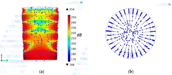 CFC resonating on fourth eigenmode and sound pressure level (dB), field section (yz plane) and positions of the microparticles at time t = 12 s and their motion trajectories in the axial plane (a) and the cross-sectional plane (b) at f0 = 13.8 kHz excitation frequency of DSPTB.