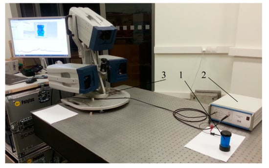 Experimental setup: 1—an experimental object CFC; 2—liner amplifier P200 (FLC Electronics AB, Partille, Sweden); 3—3D scanning vibrometer PSV-500-3D-HV (Polytec GmbH, Waldbronn, Germany).