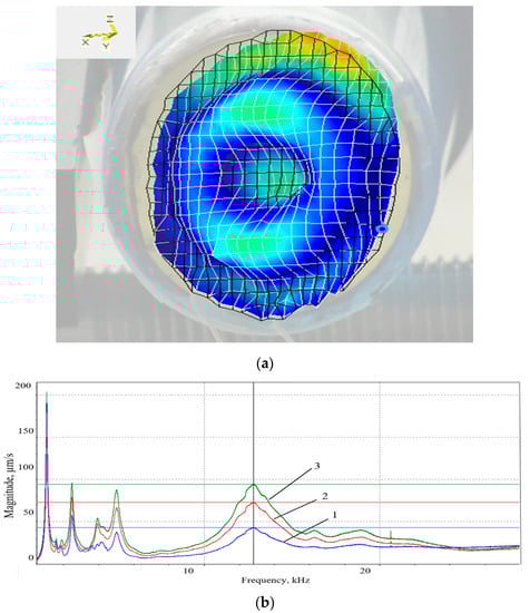 Fourth eigenmode of the DSPTB at an operational frequency of f0 = 13.5 kHz (a), and frequency response (b) in three directions: 1—Z; 2—X; 3—Y.