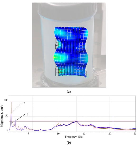 Fourth eigenmode of the CFC at an operational frequency of 13.5 kHz (a), and frequency response (b) in two directions: 1—Z; 2—X.