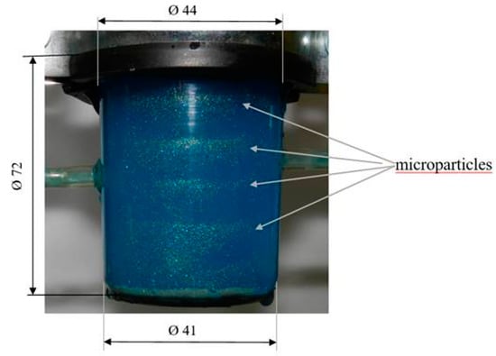 In order to align the experimental results with the simulation results, the zeolite microparticles (made by Sigma-Aldrich, 3050 Spruce street, Saint Louis, MO 63103, USA, with microparticle dimensions 0.5–15 µm.) were mixed in an artificial plasma (90% water and 10% glycerol) with a viscosity of 1.3–1.7 mPa s, which coincides with the viscosity of the blood plasma. Zeolite, the active ingredient, is micronized to the size of a red blood cell. This means that the particles of zeolite are so fine that they can actually pass in between the cells. Zeolite was chosen because the experiment with the blood would be complicated due to the rapidly changing properties of red blood cells in the blood. Standard guidelines for handling blood samples indicate that plasma or serum should be separated from the cells as soon as possible (20–30 min) after the clot formation is complete, so as to avoid clot-induced changes in the serum concentrations of the analytic liquid caused by coagulation. The agglutination of red blood cells can occur within a few minutes after finding blood outside the body. To assess the separation process of microparticles in suspension, and determine the eigenmodes of the DSPTB and CFC body, an experimental setup with a Polytec 3D scanning vibrometer (Type PSV-500-3D-HV, Polytec GmbH, Waldbronn, Germany) was developed (Figure 4).