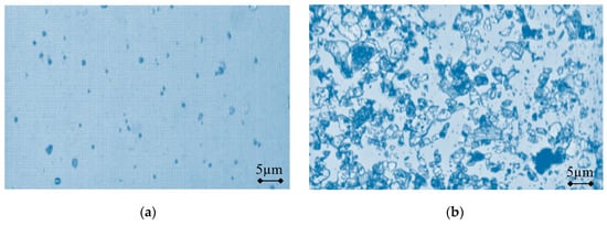 To determine the effectiveness of the microparticle separation in biological suspension, two separate samples were examined under a microscope (Figure 8). A sample of the suspension purified from the microparticle phase (Figure 8a) has been taken from container 6 (Figure 1), and a sample of the suspension enriched in microparticle phase (Figure 8b) has been taken from container 5 (Figure 1).
