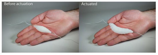 Material-actuator before and during the actuation by Joule heating (8 V, 1 A). Adopted from Miriyev, A.; Stack, K.; Lipson, H. Soft material for soft actuators [], published by Nat. Commun. 2017, under the terms of the Attribution 4.0 International (https://creativecommons.org/licenses/by/4.0/).