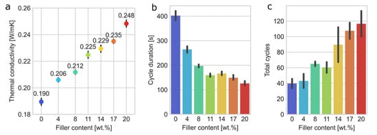 Increasing the thermal conductivity of the silicone/ethanol material-actuator has several advantages: the material will dissipate heat more efficiently; the maximum temperature around the heating element will decrease (alleviating thermal degradation); the cooling process will be accelerated. For this purpose, we added the diamond-nanoparticle-based thermally-conductive grease to the silicone/ethanol composite in various filler/matrix ratios. Figure 2a shows the effect of the filler concentration on the thermal conductivity of silicone/ethanol composite. It was observed that the thermal conductivity increases linearly with filler content from 0.190 ± 0.003 W/mK for 0 wt.% to 0.248 ± 0.003 W/mK for 20 wt.%. Simultaneously, the average actuation/de-actuation operation cycle duration decreases with increasing filler content: it was measured at 402 ± 55 s for 0 wt.%, 197 ± 18 s for 8 wt.%, and at 125 ± 26 s for 20 wt.% filler material (Figure 2b). In addition, the total amount of cycles performed by 8 wt.% filler material-actuator was increased as compared to the 0 wt.% filler material (65 ± 2 cycles vs. 40 ± 7 cycles, accordingly) (Figure 2c). Material-actuators with higher filler concentration (14–20 wt.%) showed a significantly higher maximal number of actuation cycles while exhibiting a non-uniform result distribution, reflected in a high standard deviation.