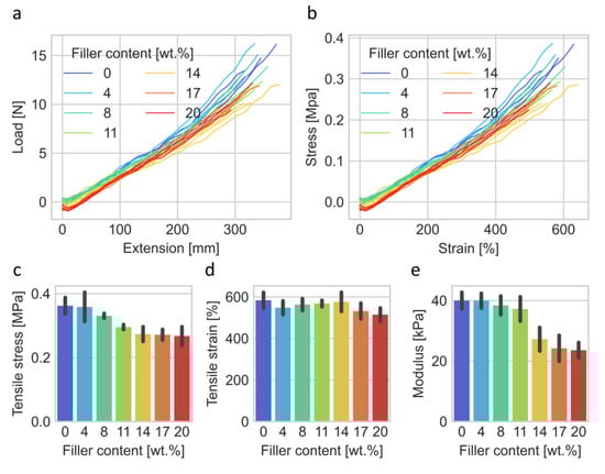 Mechanical properties (tensile test) of the silicone/ethanol composite material with various diamond nanoparticles-based filler concentrations (0 wt.%, 4 wt.%, 8 wt.%, 11 wt.%, 14 wt.%, 17 wt.%, and 20 wt.%): (a) extension vs. load; (b) strain vs. stress; (c) stress at failure; (d) strain at failure; (e) modulus at 100% elongation.