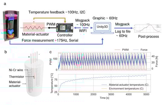 We developed a Unity3D graphics interface (GUI) on the master computer to monitor and automatically control the testing (shown in Figure A1c). The program monitored the temperature of the material-actuator, the ambient temperature, the PWM voltage input, and the force sensor output. The force sensor communicated directly with the Unity program at 175 Hz via a serial connection. Figure 4a summarizes the controlling scheme.